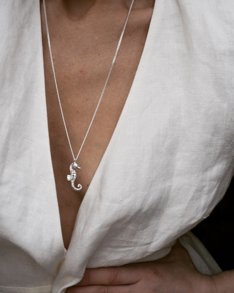 How deep is your love? The Seahorse Necklace dives into bold elegance with a splash of ocean magic. Crafted in solid sterling silver, the sculpted seahorse pendant is full of intricate detail and underwater charm—a sea-inspired piece with serious style.
