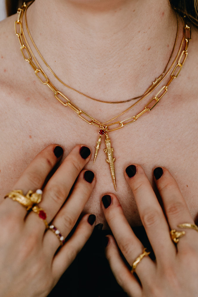 The Mini Love Bite Necklace is a reminder that love doesn’t need to be loud to leave its mark. The alligator’s bite meets the garnet’s fire, wild energy in a delicate form. Powerful, personal, unforgettable.