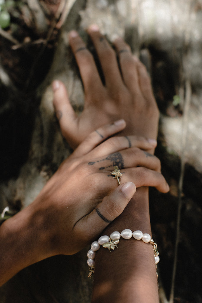 Sweet meets striking in the Beehive Pearl Bracelet—a bold blend of natural elegance and raw edge. Three sculpted 18 k gold plated on silver bees sit playfully along a strand of luminous freshwater pearls, turning a classic into something wild and unforgettable.