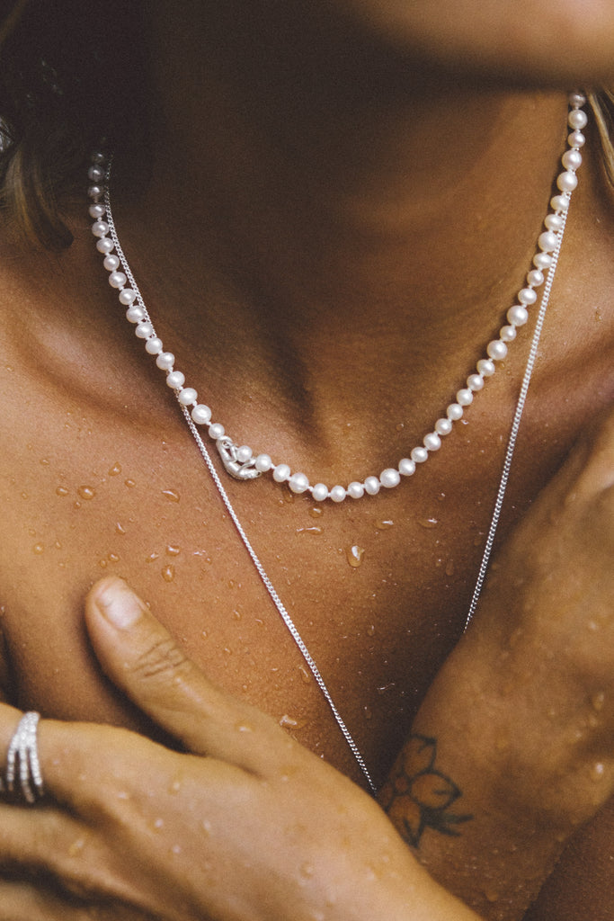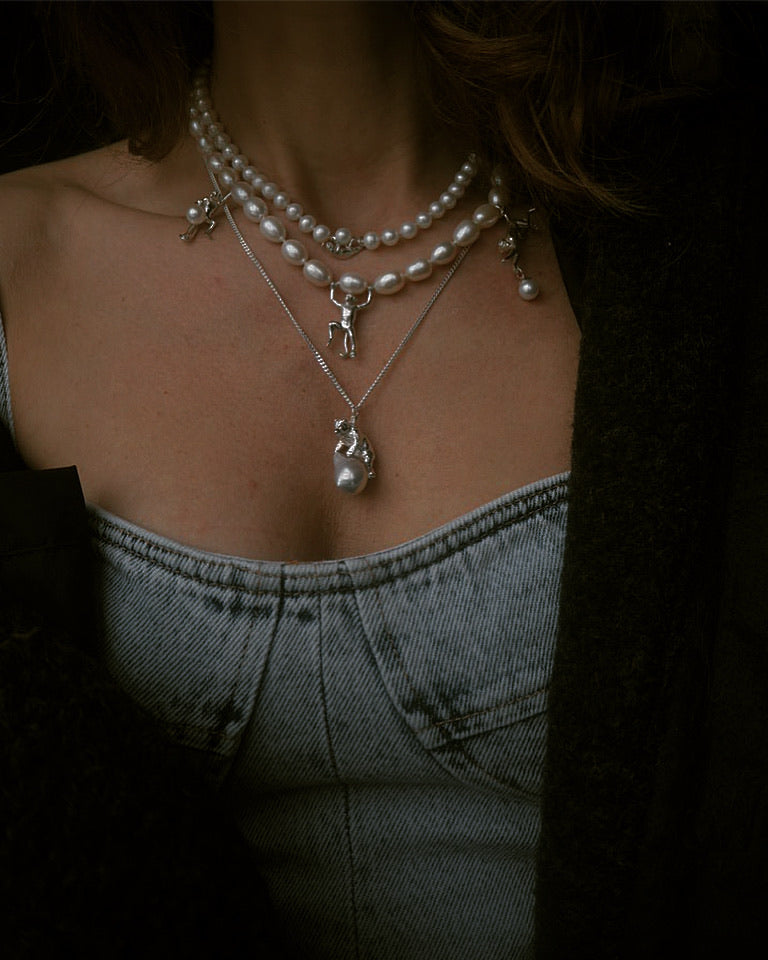 This playful piece features a tiny chameleon hanging from a delicate pearl collier, made with 4-5 mm pearls that add a touch of elegance to its whimsical design. A perfect balance of nature-inspired artistry and refined luxury, this necklace adapts to your style while staying chic and understated.