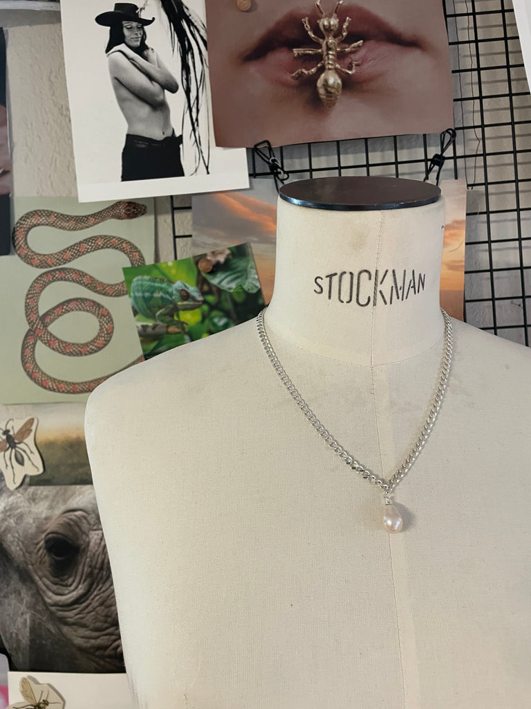 The heavy chain adds a bold touch, while the irregular pearl keeps it fresh and unexpected. A perfect mix of refined luxury and raw attitude, this piece is designed for those who dare to make a statement.