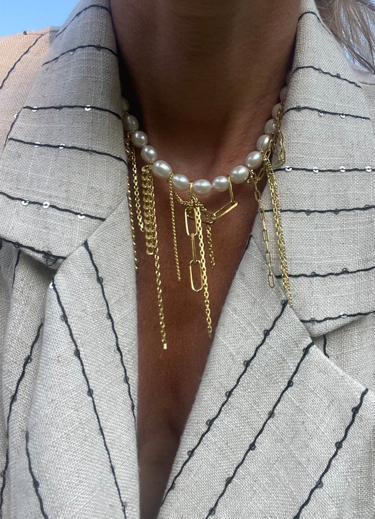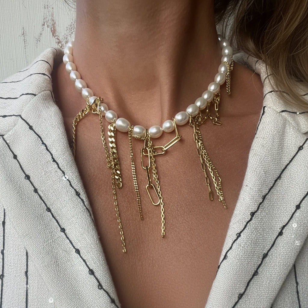 Born from chaos and grace, the Tangled Pearl Necklace clashes different chains with glowing pearls — a striking tension between wild and refined. It’s a rebellion against the ordinary, capturing the moment when beauty breaks free from order, tangled and untamed, just one kiss away from transformation.